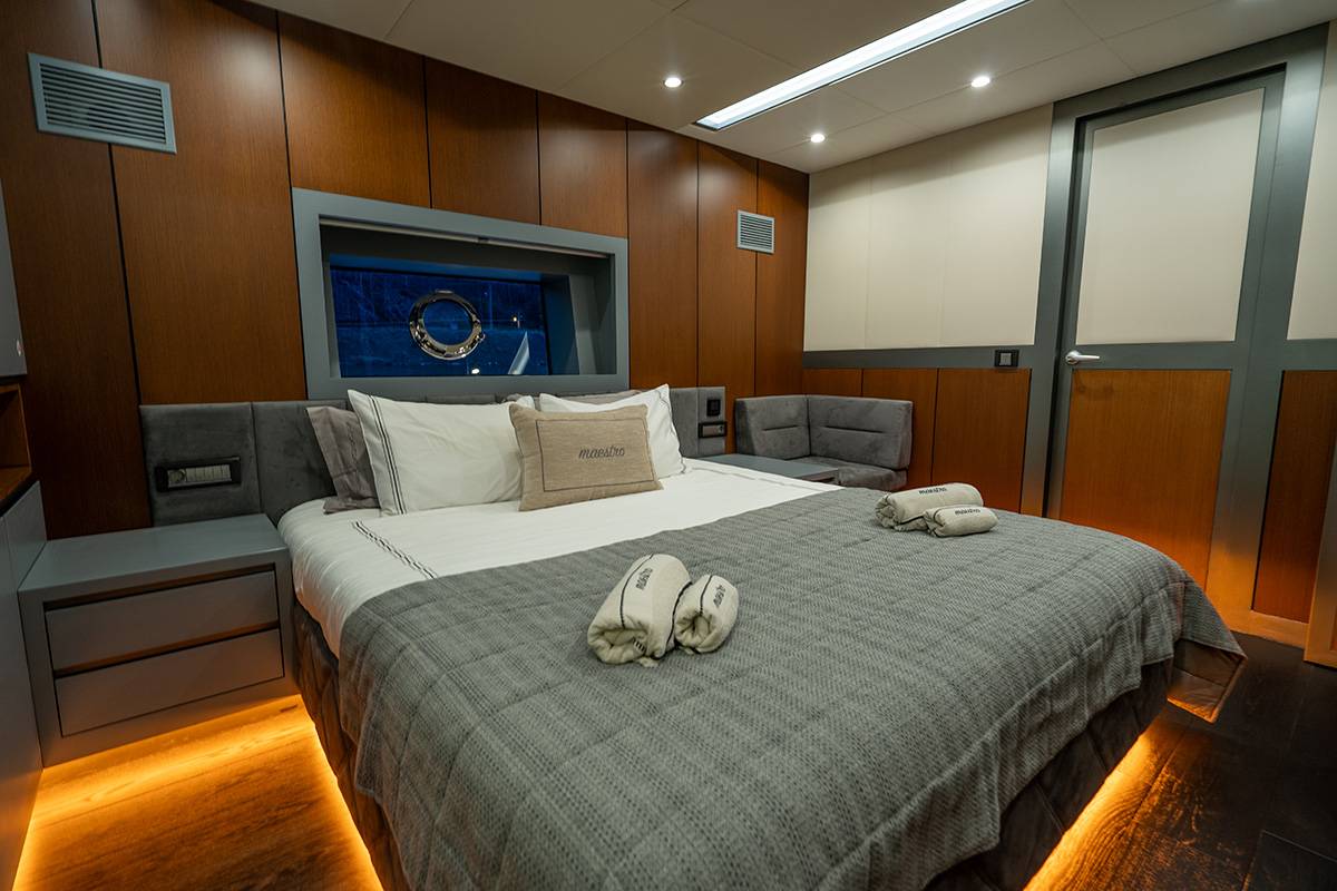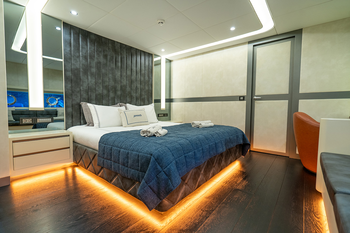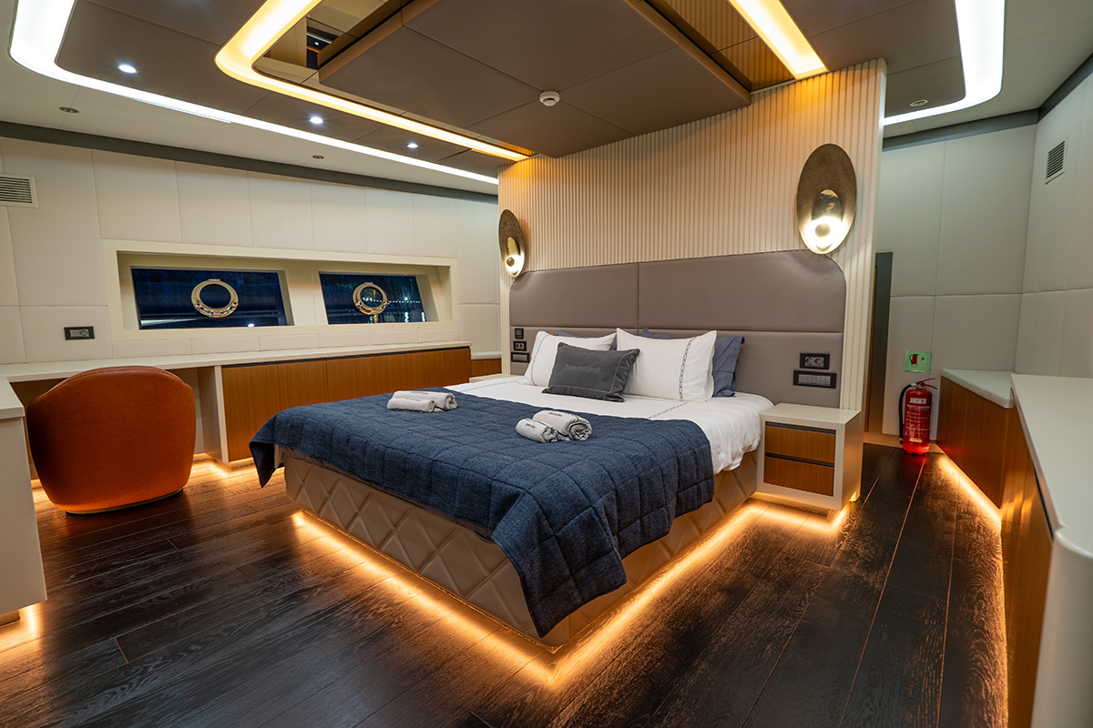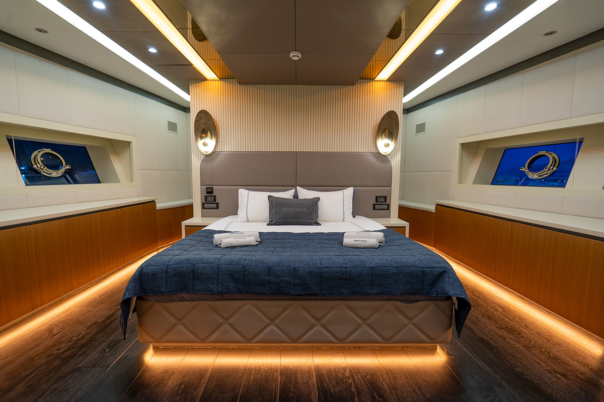 All cabins and the saloon are equipped with air conditioning, Smart TVs, Bluetooth audio systems, laundry & ironing service, watermaker, sunbathing towels, premium linens, and free Wi-Fi. Advanced technical systems ensure maximum comfort even during long passages.