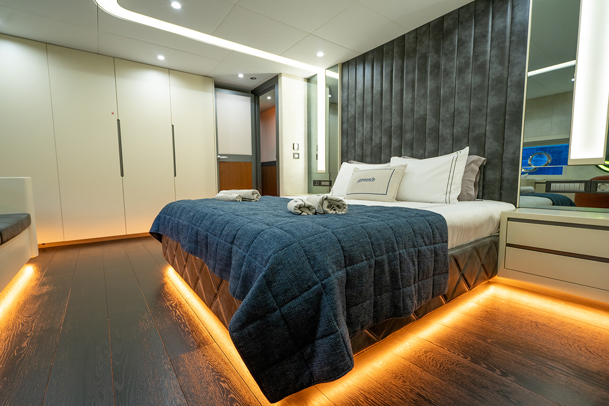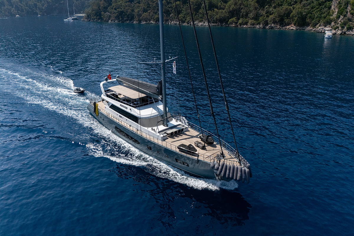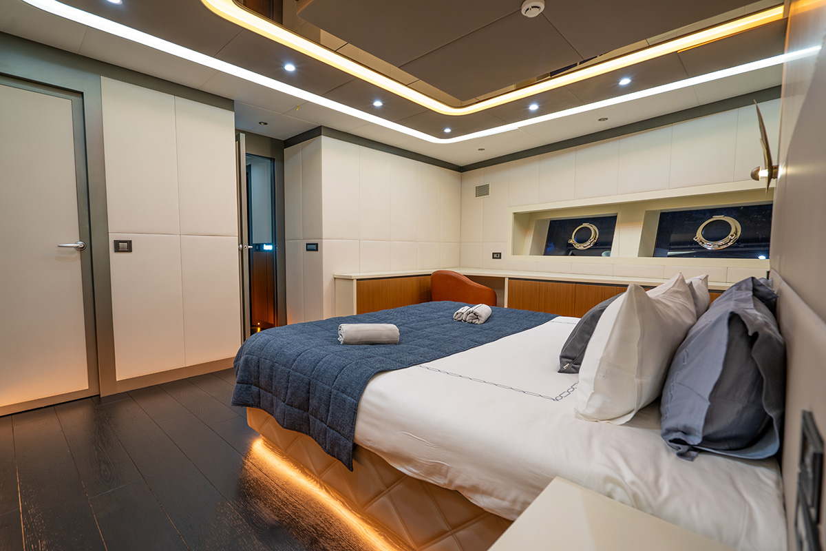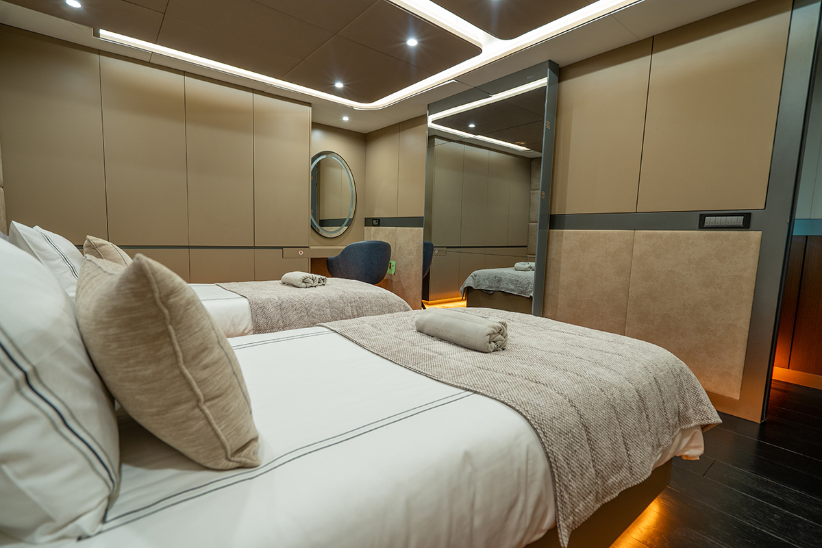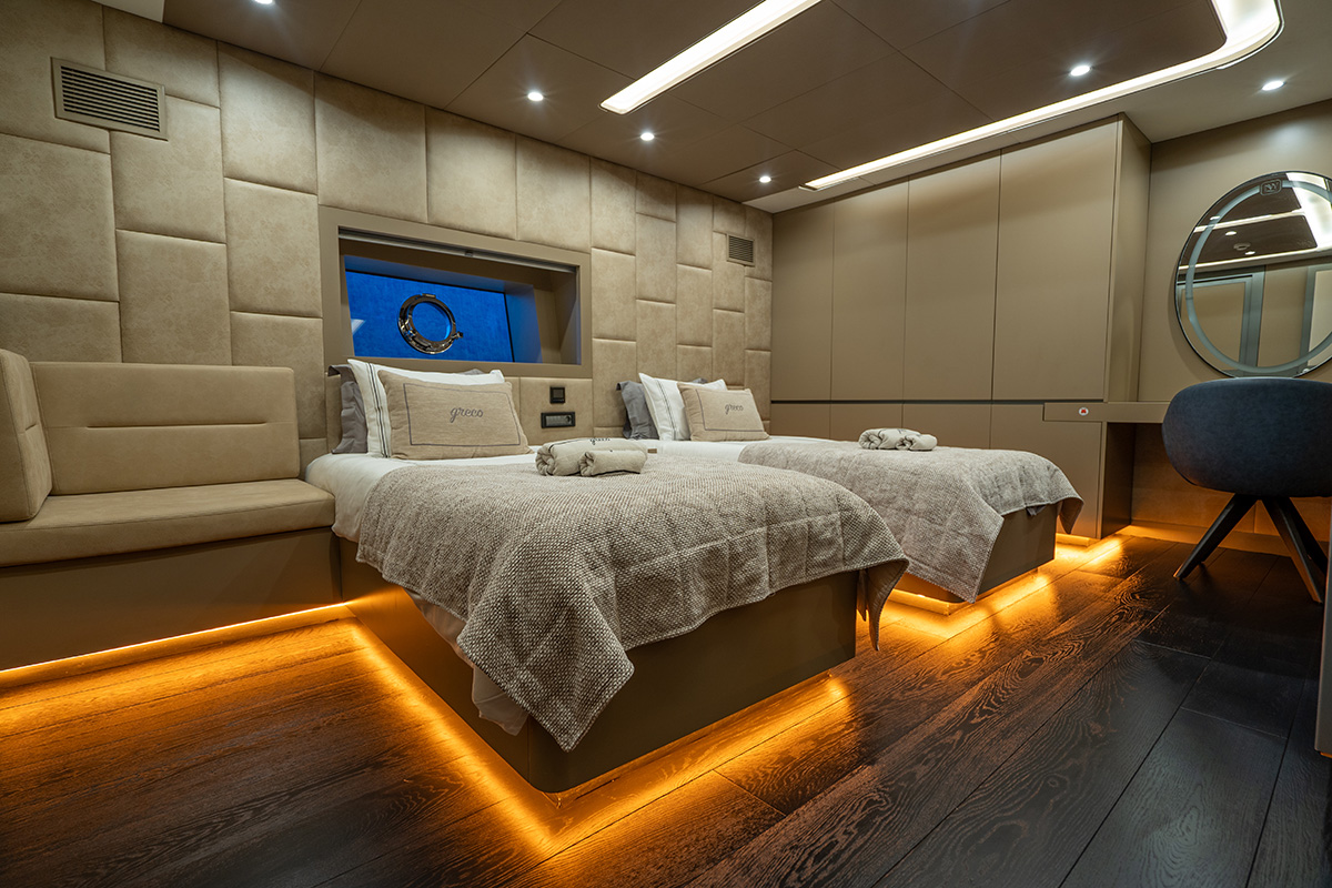 All cabins and the saloon are equipped with air conditioning, Smart TVs, Bluetooth audio systems, laundry & ironing service, watermaker, sunbathing towels, premium linens, and free Wi-Fi. Advanced technical systems ensure maximum comfort even during long passages.