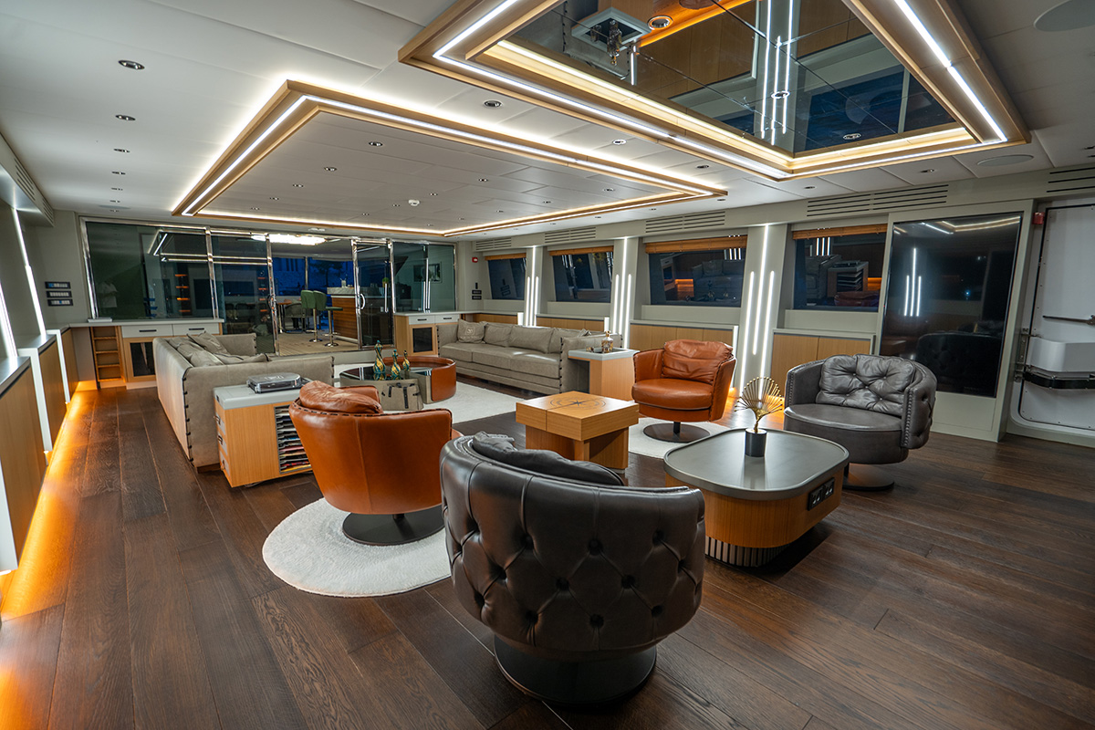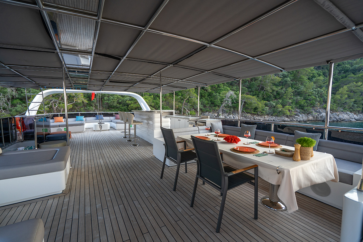 The expansive foredeck offers large sunbathing areas with premium cushions and stylish lounge spaces. The aft deck features a spacious dining area, elegant seating arrangements, and shaded relaxation zones. Every outdoor detail is designed to reflect the comfort and sophistication of an ultra deluxe yacht.