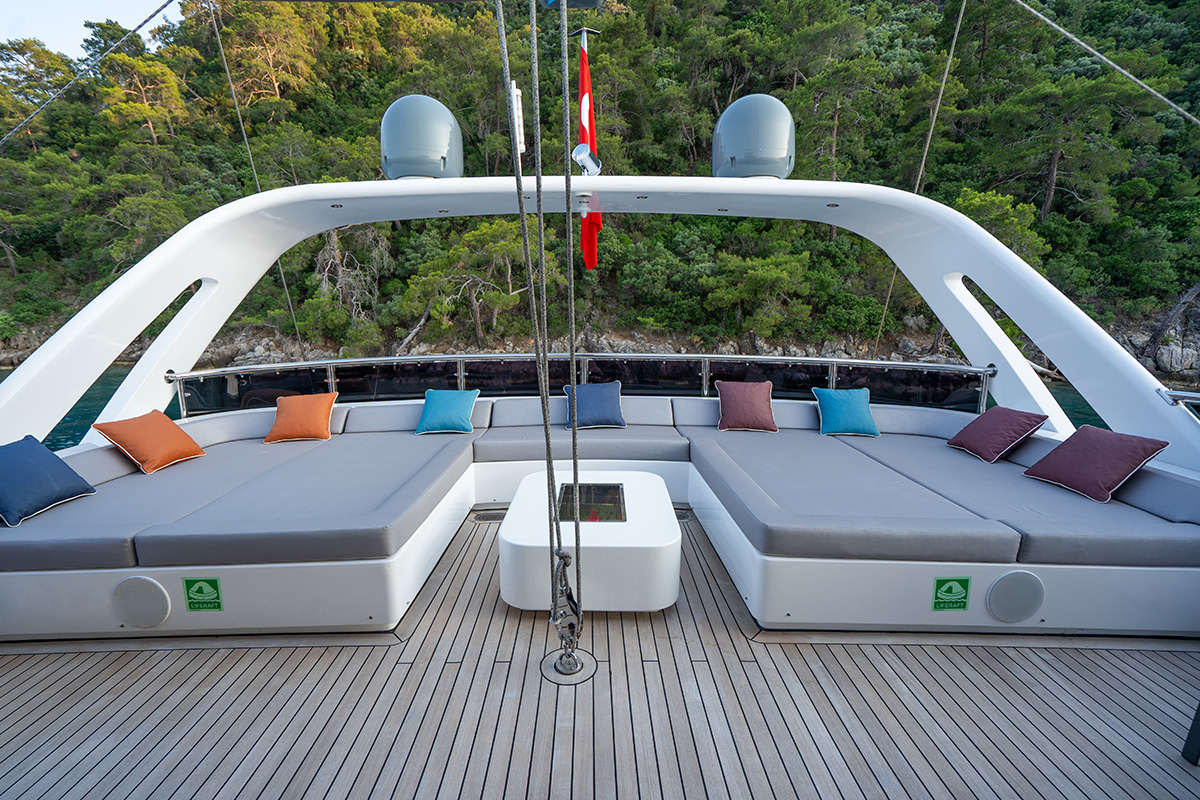The saloon offers a luxurious indoor environment featuring Smart TV, Bluetooth sound system, spacious seating, and elegant interior styling. Coffee machines and a fully equipped galley ensure comfort at any time of the day.